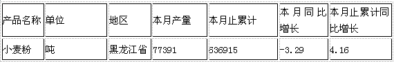 2013年1-11月,黑龙江省小麦粉产量为636915吨,同比增长4.16%。