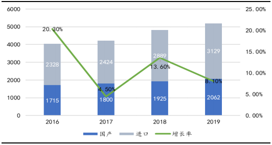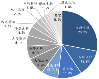 中国人血白蛋白批签发数量呈逐年增长态势,2019 全年度批签发数量约为 5191 万瓶(10g/瓶)同比增长 8%。进口占比为60.3%(与 2018 年基本持平),其中杰特贝林(CSL Behring)人血白蛋白批签发最多,市场占比为 28.2%,其次为百特(Baxalta)市场占比为 12.8%,基立福(Grifols)市场占比为 11.0%,奥克特珐玛(Octapharma)市场占比为 7.6%。