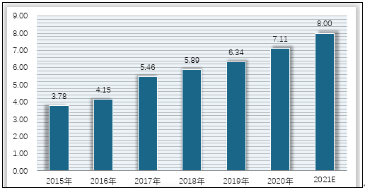2015-2021年全球工业相机市场规模预测情况(单位:亿美元)