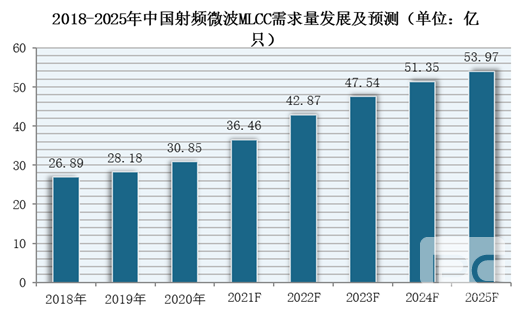 中国作为全球最大的射频微波MLCC市场,中国市场对射频微波MLCC的需求量占世界需求量的比例超过60%。2020年中国射频微波MLCC需求量约为30.9亿只,同比增长9.5%;2021年中国射频微波MLCC市场需求量将增长至36.5亿只,同比增长18.2%,到2025年将达54.0亿只。