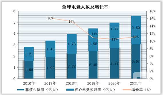 2016-2021年全球电竞人数及增长率