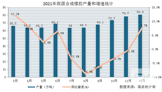 据统计数据显示,2021年1-12月全国合成橡胶产量累计值811.7万吨,同比增长2.6%。