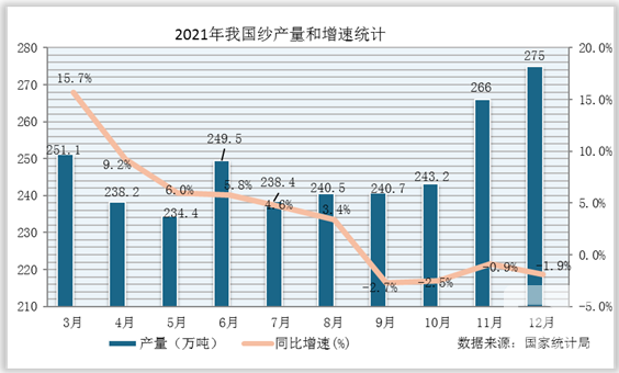据统计数据显示,2021年1-12月我国纱产量累计值2873.7万吨,同比增长8.4%。