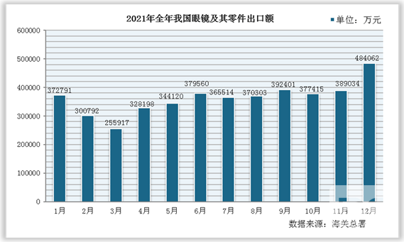 据统计数据显示,2021年1-12月我国眼镜及其零件出口额为4306196万元,同比增长15.6%。(YA)
