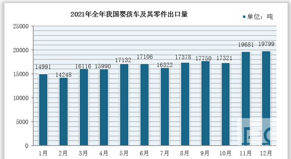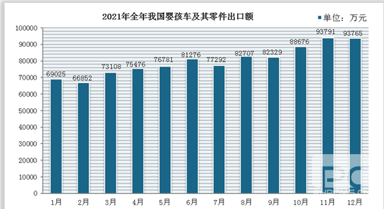 据统计数据显示,2021年1-12月我国婴孩车及其零件出口量为203912吨,同比增长10%;出口额为959829万元,同比增长9%。(YA)