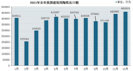 据统计数据显示,2021年1-12月我国建筑用陶瓷出口量为1316万吨,同比增长0.2%;出口额为4573097万元,同比增长4.7%。(YA)