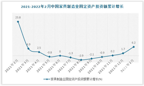 根据统计数据显示,2022年2月我国家具制造业固定资产投资额累计增长6.2%。
