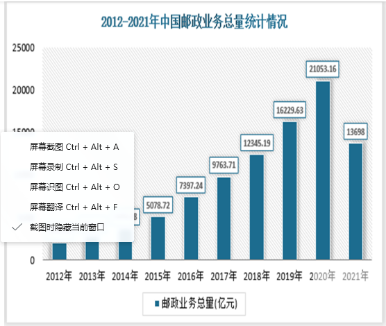 据统计数据显示,2021年邮政业务总量为13698亿元,较上年下降7355.16亿元。