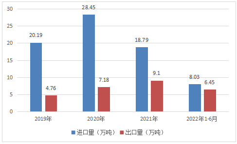 据统计,2015年我国聚丁二烯橡胶的进口量为23.1万吨,2018年的进口量为19.41万吨,同比减少约27.6%,是国内近10年来顺丁橡胶进口量最低的一年,截至2022年上半年我国顺丁橡胶进口量为8.03万吨,同比下降18.34%,出口量为6.45万吨,同比增长28.14%。