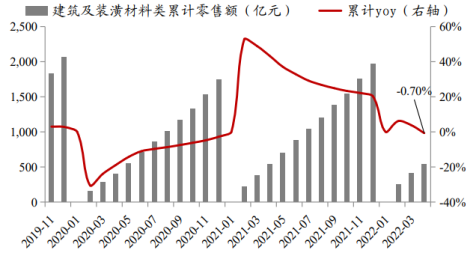 统计显示,2022年4月建筑及装潢材料类当月零售额142.0亿元,同比减少11.7%;1-4月建筑及装潢材料类累计零售额541亿元,同比减少0.7%。