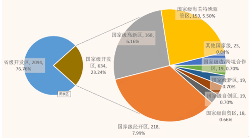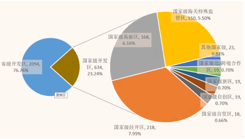 截至2021年4月26日,我国共有各类国家级开发区634家,其中国家级经济技术开发区共有218家,国家级高新技术产业开发区共有168家,国家级海关特殊监管区150家,国家级边/跨境经济合作区共有19家,国家级自贸区共有18家,国家级新区共有19家,国家级自主创新示范区共有19家,其他国家级开发区共有23家;省级开发区共有2094家。