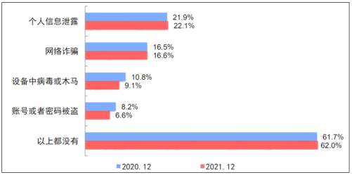 根据调研显示,截至2021年12月,62.0%的网民表示过去半年在上网过程中未遭遇过网络安全问题,与2020年12月基本保持一致。此外,遭遇个人信息泄露的网民比例最高,为22.1%;遭遇网络诈骗的网民比例为16.6%;遭遇设备中病毒或木马的网民比例为9.1%;遭遇账号或密码被盗的网民比例为6.6%。