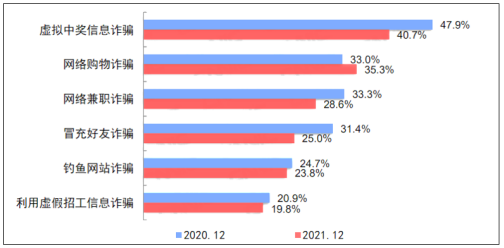 通过对遭遇网络诈骗网民的进一步调查发现,除网络购物诈骗外,网民遭遇其他网络诈骗的比例均有所下降。其中,虚拟中奖信息诈骗仍是网民最常遭遇的网络诈骗类型,占比为40.7%,较2020年12月下降7.2个百分点;遭遇网络购物诈骗的比例为35.3%,较2020年12月提升2.3个百分点;遭遇网络兼职诈骗的比例为28.6%,较2020年12月下降4.7个百分点;遭遇冒充好友诈骗的比例为25.0%,较2020年12月下降6.4个百分点;遭遇钓鱼网站诈骗的比例为23.8%,较2020年12月下降0.9个百分点;遭遇利用虚假招工信息诈骗的比例为19.8%,较2020年12月下降1.1个百分点。