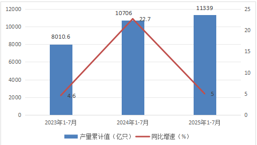 累计值来看,2025年1-7月我国光电子器件产量约为11339亿只(片、套),同比增长5%。整体来看,近三年1-7月同期我国光电子器件产量呈增长走势。
