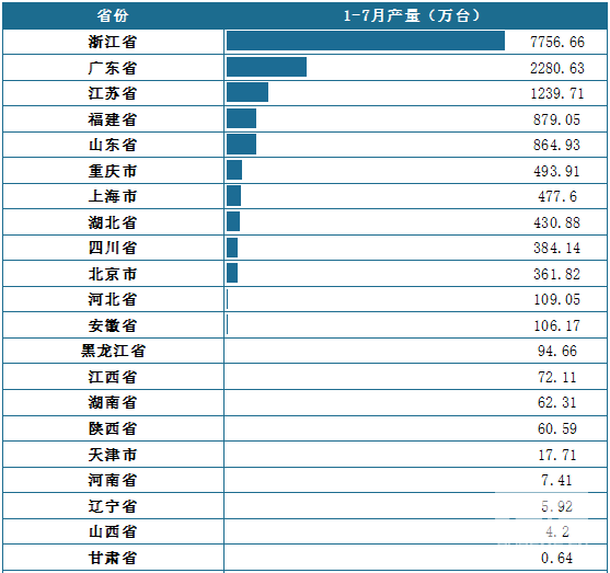 产量地区分布来看,2025年1-7月我国电工仪器仪表累计产量排名前三的省市分别为浙江省、广东省、江苏省,产量分别为7756.66万台、2280.63万台、1239.71万台。