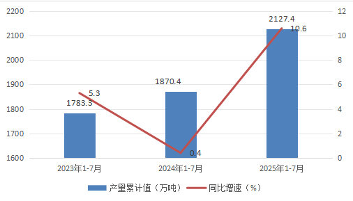2023-2025年7月我国乙烯产量累计值及同比增速情况