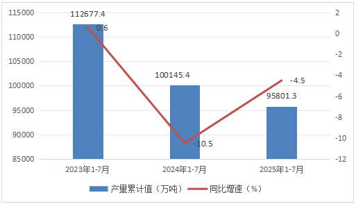 数据显示,2025年7月份我国水泥产量约为14557.3万吨,同比下降5.6%;1-7月我国水泥产量约为95801.3万吨,同比下降4.5%。整体来看,近三年7月同期我国水泥产量当期值和累计值均呈下降走势。