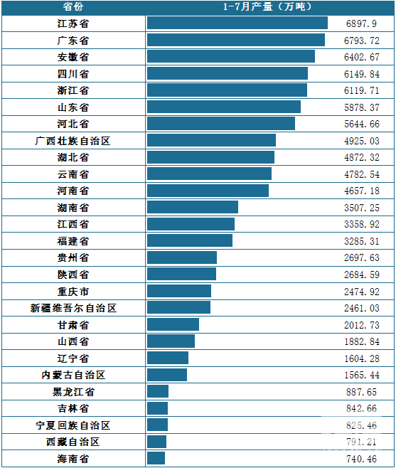 2025年1-7月中国各省份水泥产量