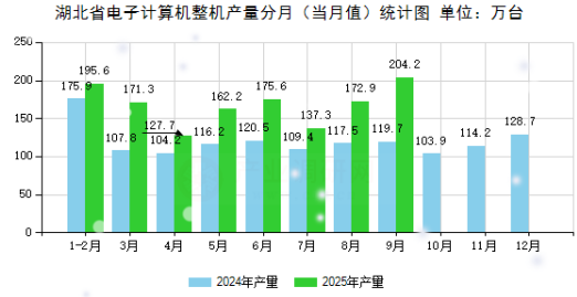 据统计,2025年9月湖北省规模以上工业企业电子计算机整机产量与上年同期相比增长了70.6%,达204.2万台,增速较上一年同期高93.5个百分点,增速较同期全国高75.4个百分点,约占同期全国规模以上企业电子计算机整机产量3266.1397万台的比重为6.3%。