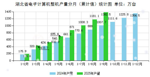 据统计,2025年1-9月,湖北省规模以上工业企业电子计算机整机产量与上年同期相比增长了37.2%,达1382.5万台,增速较上一年同期高30.3个百分点,继续保持增长,增速较同期全国高36.8个百分点,约占同期全国规模以上企业电子计算机整机产量26190.7456万台的比重为5.3%。详见下图: