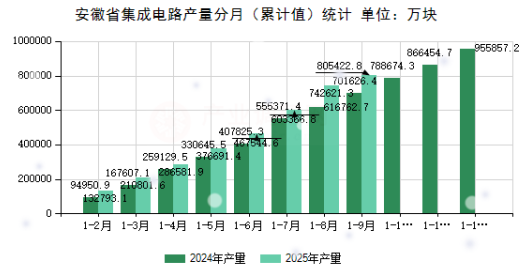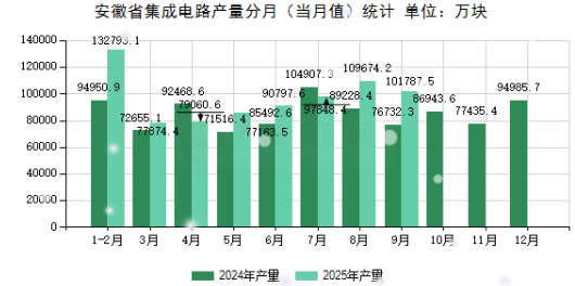 单独看2025年9月份,安徽省规模以上工业企业集成电路产量达到了101787.5万块,与2024年同期的数据相比,9月份的产量增长了32.7%,增速较2024年同期高2.7个百分点,继续保持快速增长。