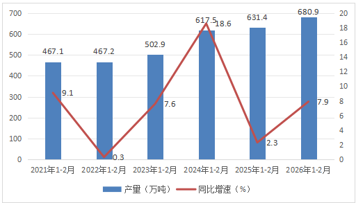 数据显示,2026年1-2月我国纯碱产量约为680.9万吨,同比增长7.9%。整体来看,近六年同期我国纯碱产量呈增长走势。